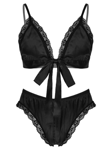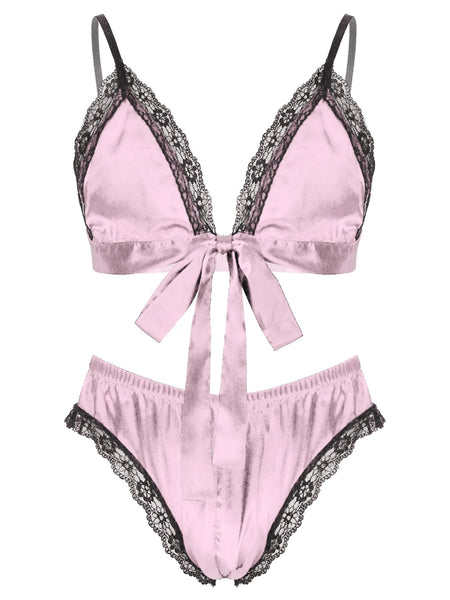 - Two-piece satin pajama set include with bra top and elastic waistband briefs.